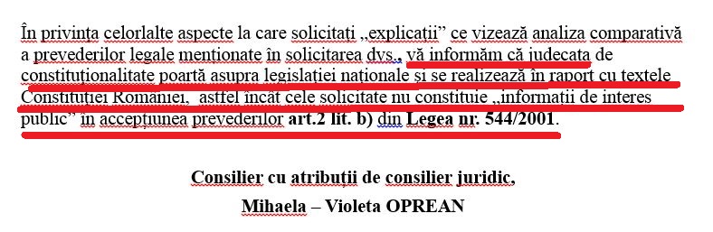 “În privinţa celorlalte aspect la care solicitaţi “explicaţii” ce vizează analiza comparativă a prevederilor legale menţionate în solicitarea dumneavoastră, vă informăm că judecata de constituţionalitate se poartă asupra legislaţiei naţionale şi se realizează în raport cu textele Constituţiei României, astfel încât cele solicitate nu constituie “informaţii de interes public”, în accepţiunea prevederilor art. 2, lit. b din Legea 544/ 2001.”