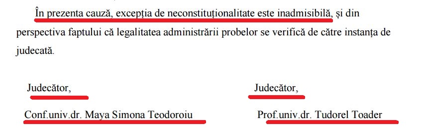 Doi judecători ai Curţii, judecătorii Maya Simona Teodoroiu şi Tudorel Toader au făcut opinie separată la Decizia nr.51 din 16 februarie 2016, susţinând că este inadmisibilă acceptarea excepţiei de neconstituţionalitate iar Avocatul Poporului a susţinut că actualele prevederi din Codul de Procedură Penală sunt legale. ( click decizia CCR cu opinii separate pe inadmisibilitate)